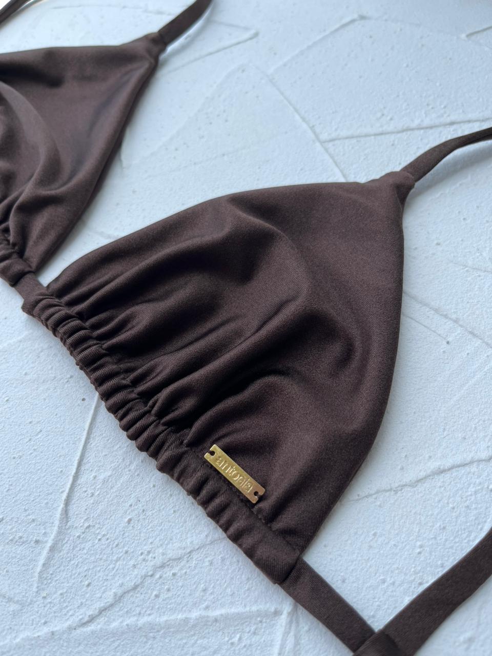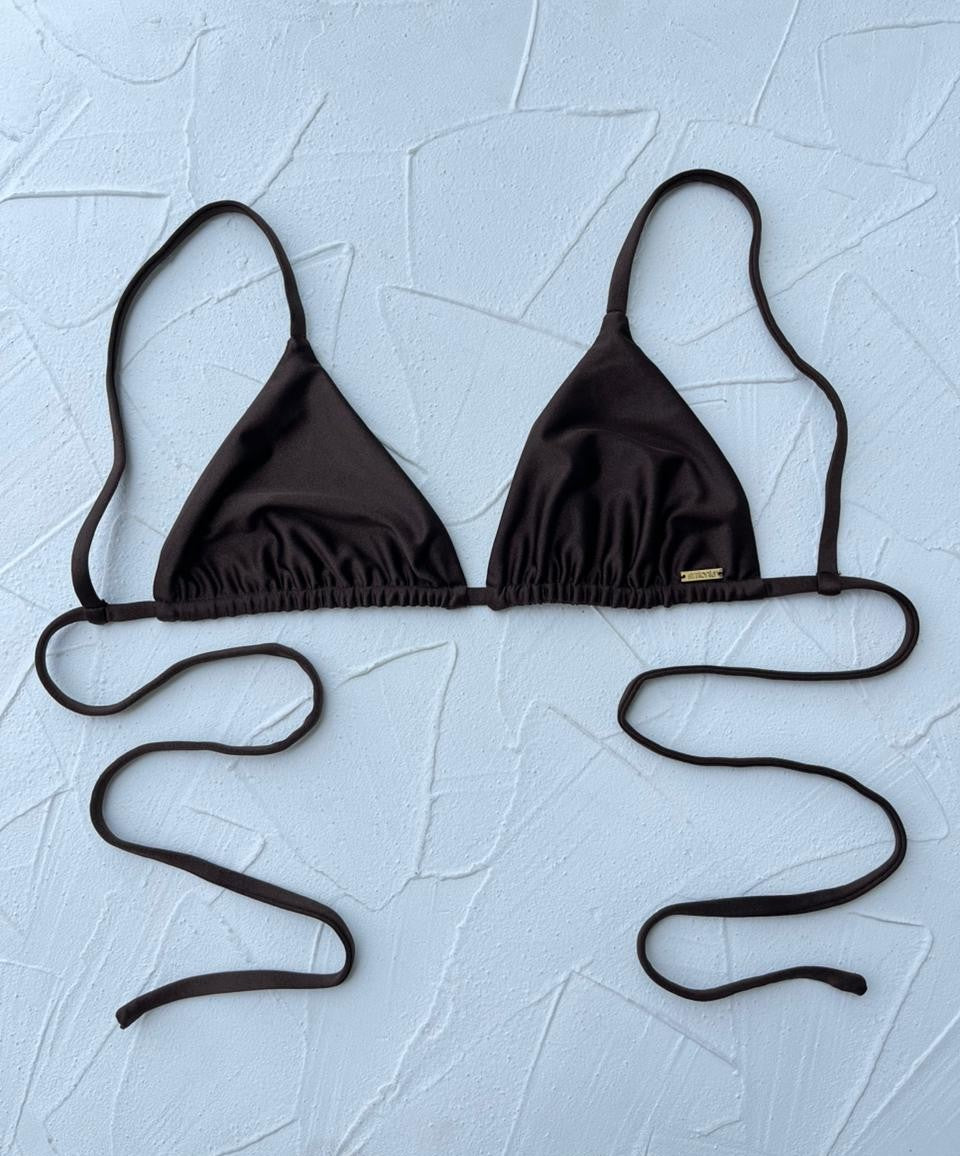 Top triangulo con pitas, pueden amarrase al cuello o hombros. Como es reversible a mate, al menos que sacrifiques uno de los lados, no se podrá poner copas.